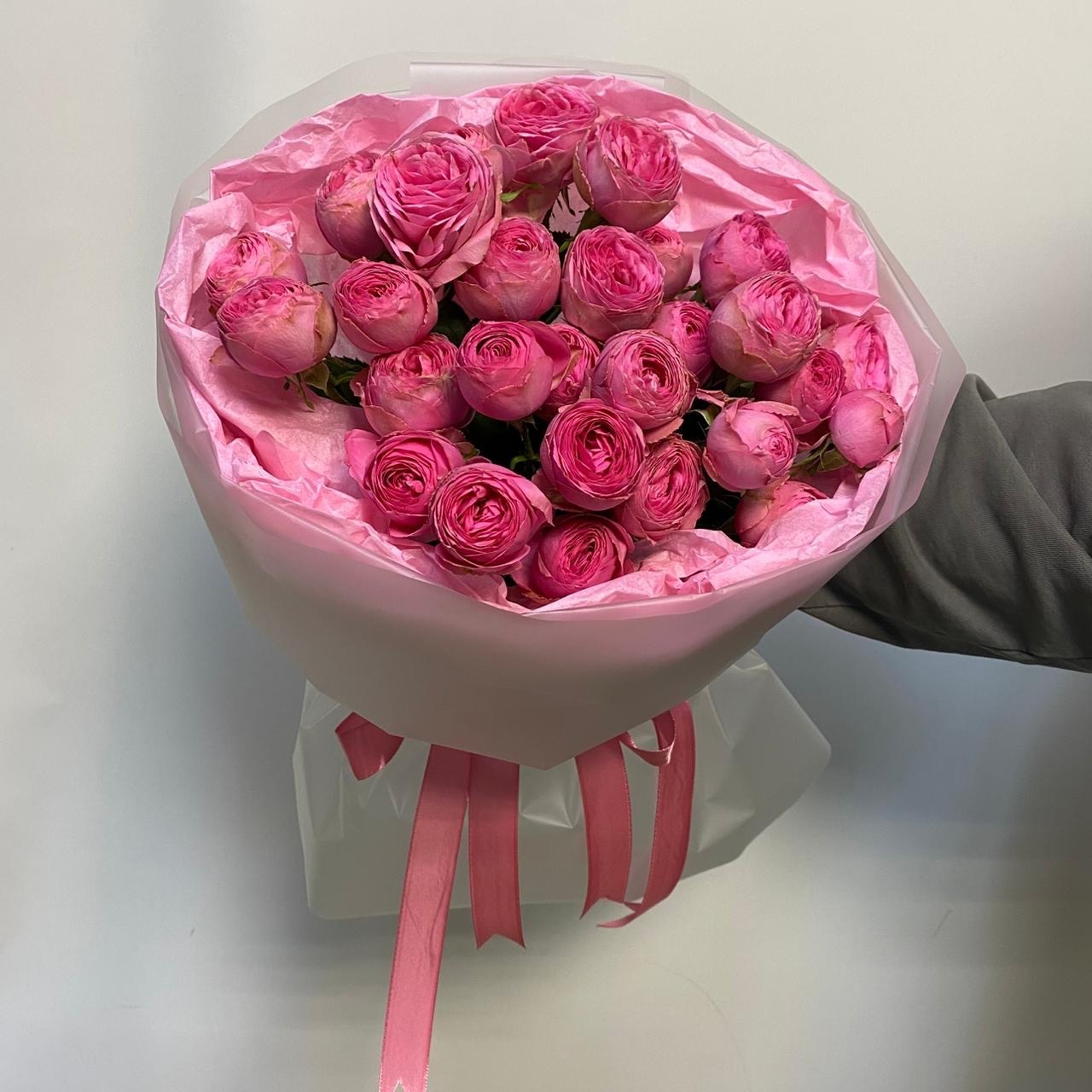 состав: роза кустовая пионовидная - 5 шт , упаковка современная с тишью и атласной лентой