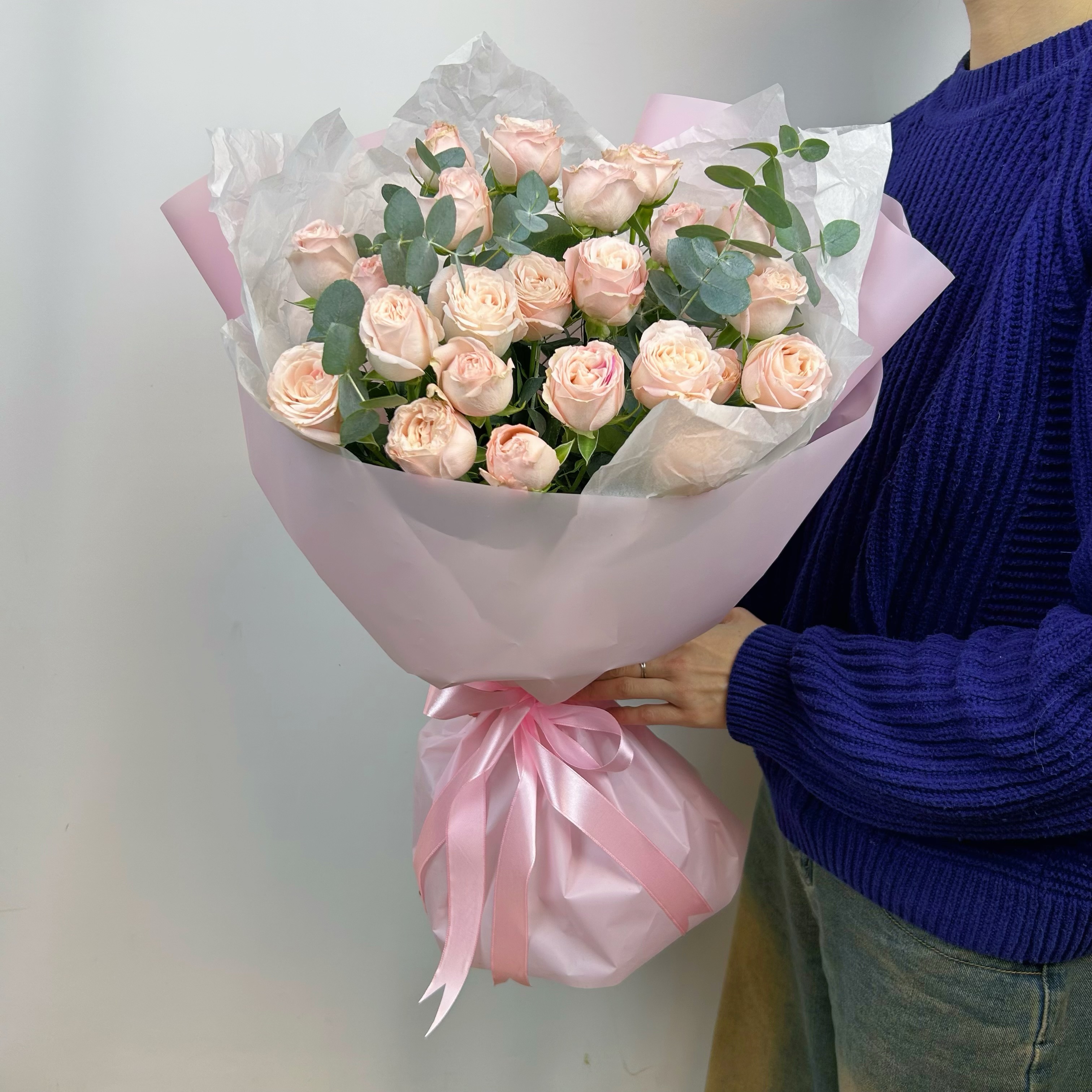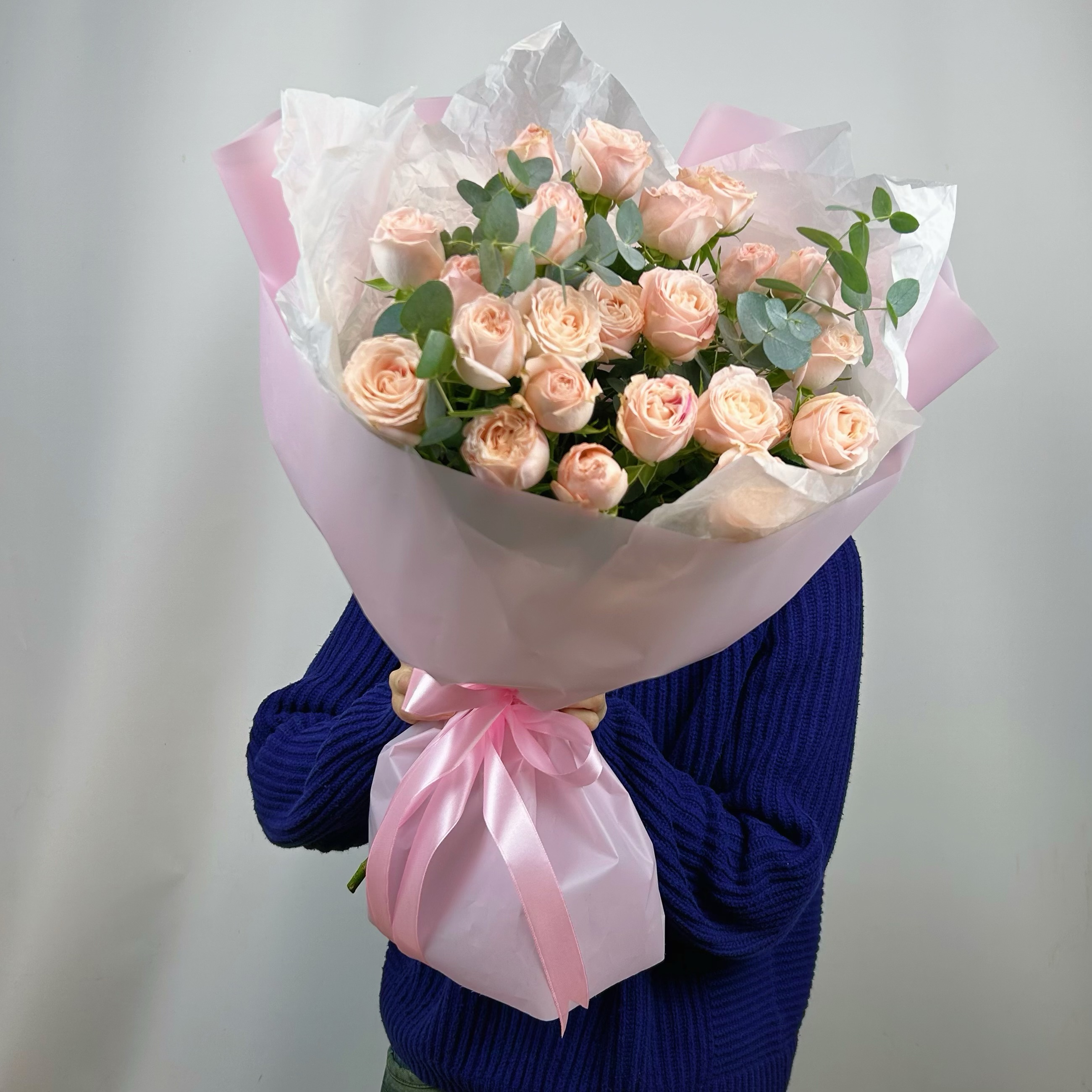 состав: роза кустовая пионовидная - 7 шт , эвкалипт, упаковка современная с тишью и атласной лентой