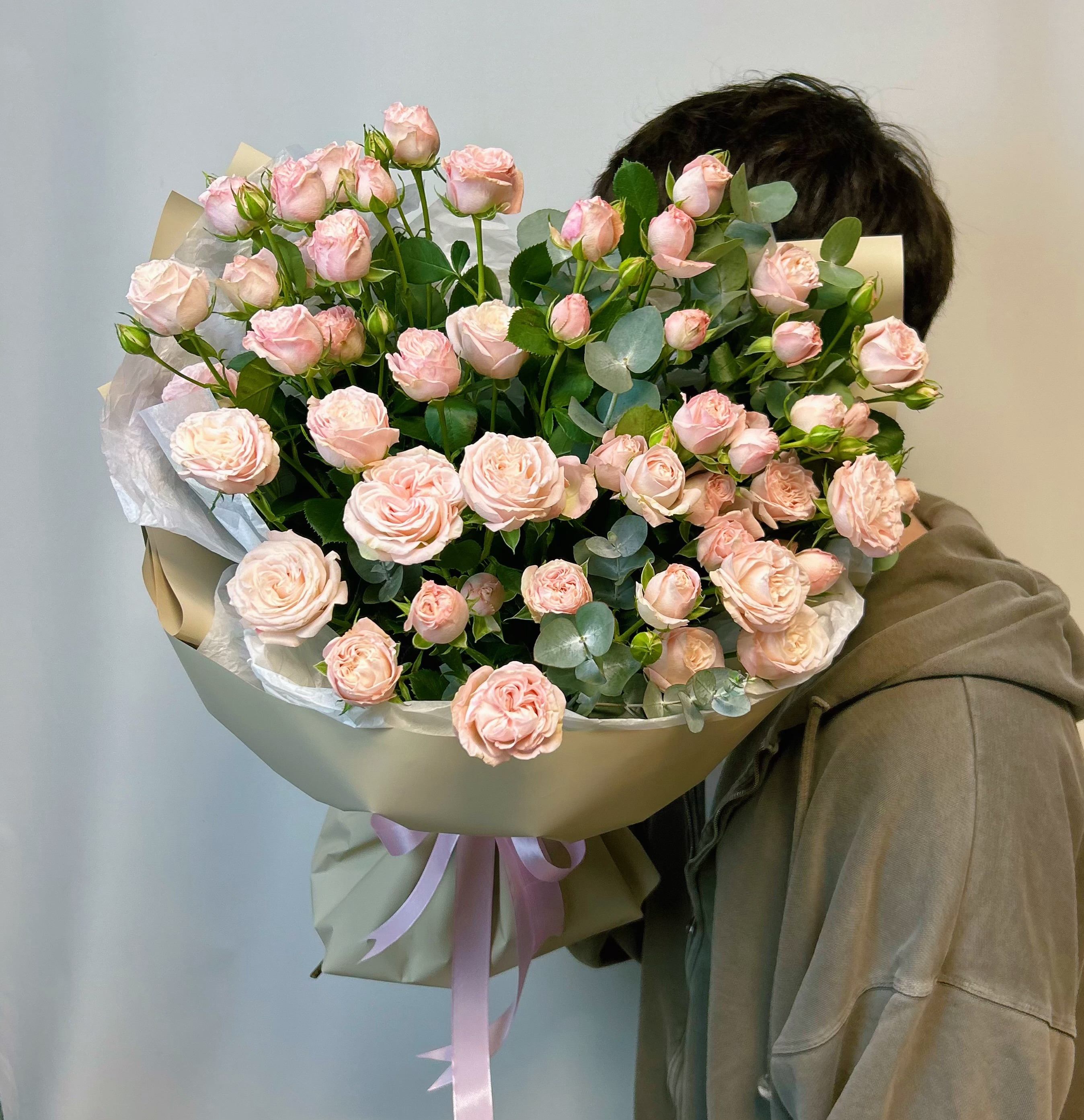 Букет из кустовой пионовидной розы и ароматного эвкалипта станет прекрасным дополнением к подарку