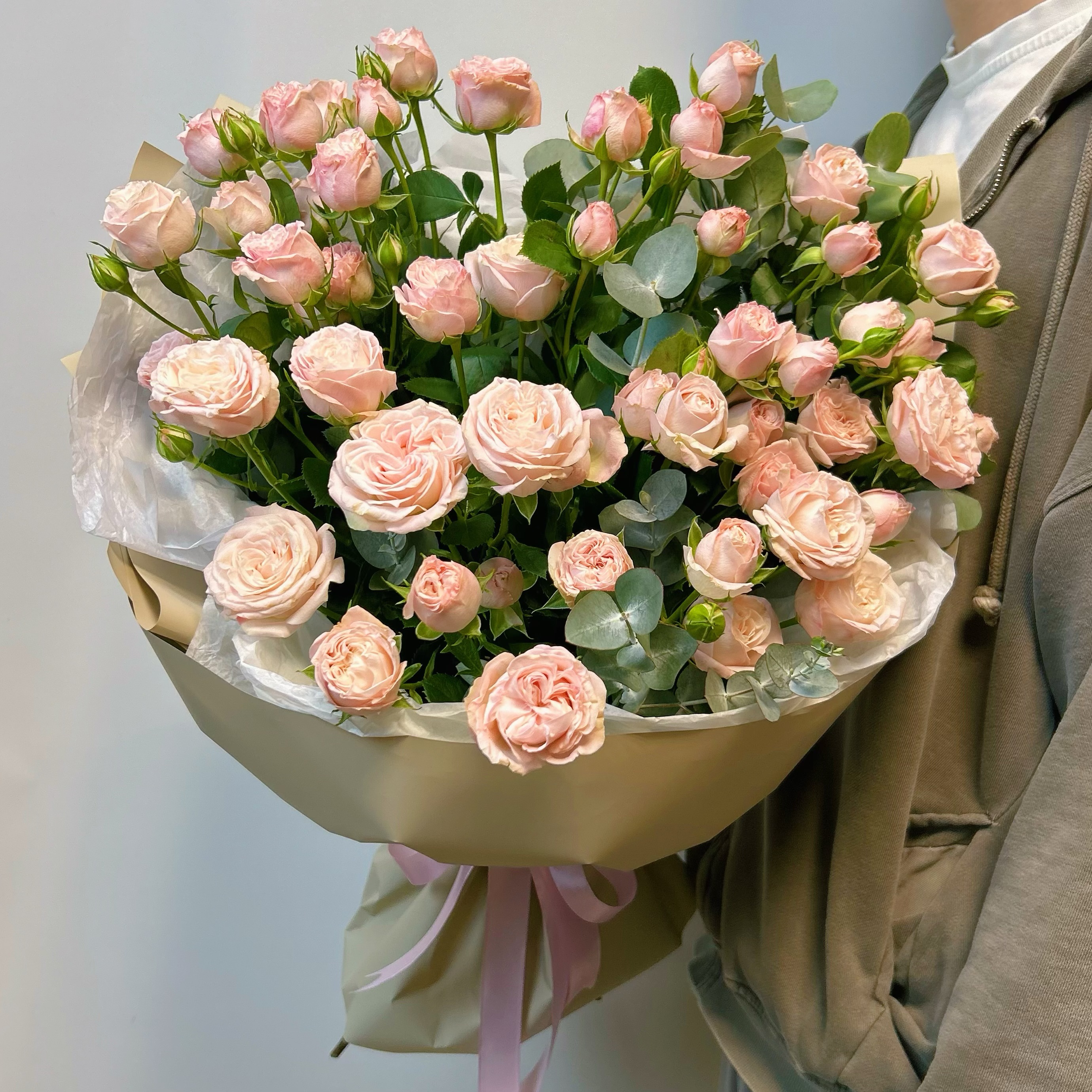 состав: роза кустовая пионовидная - 15 шт , эвкалипт, упаковка современная с тишью и атласной лентой