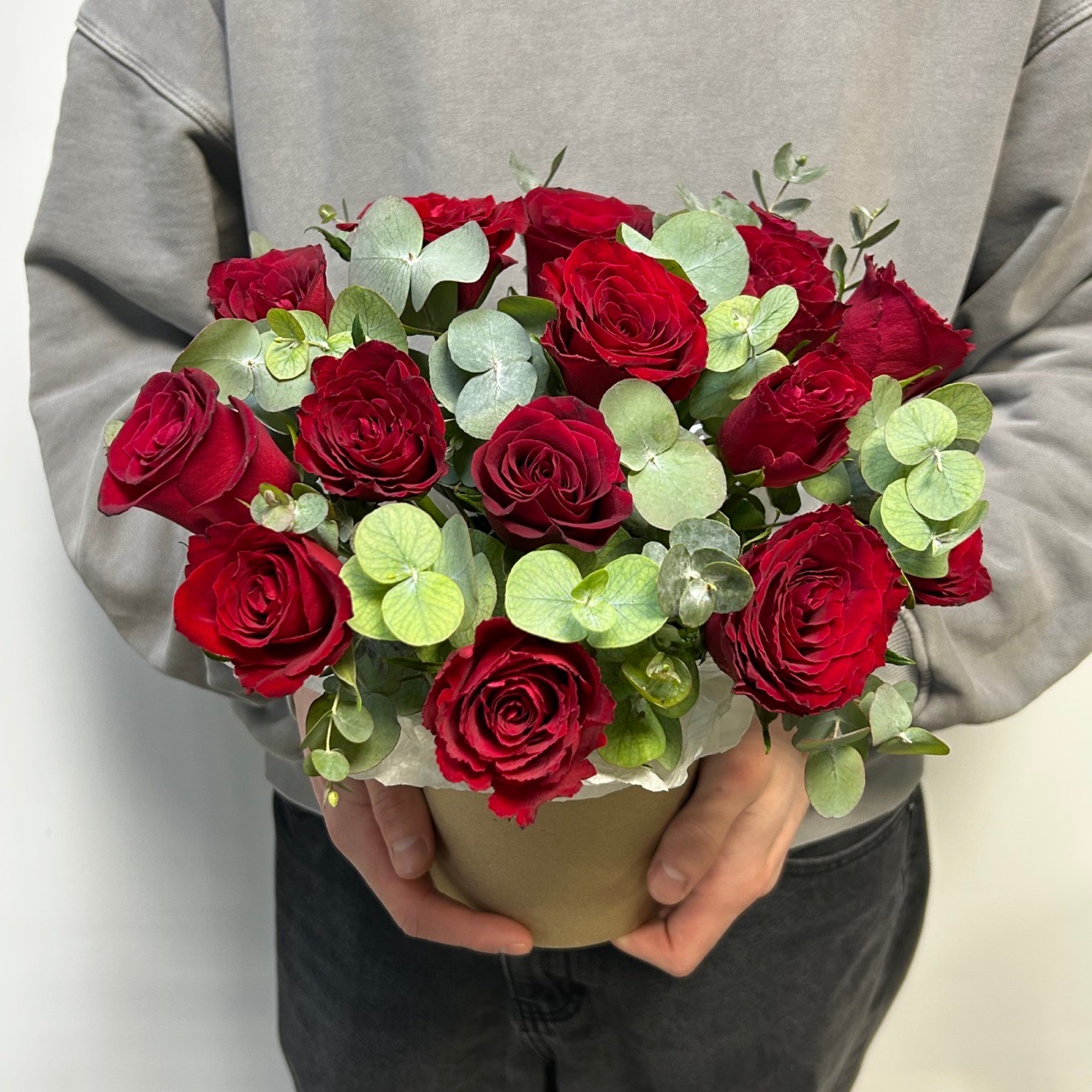 Композиция в коробке с красными розами ( небольшие по бутону ) и эвкалипт