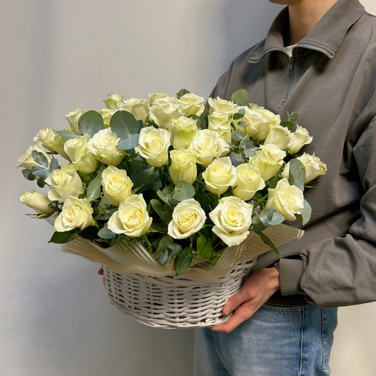 Композиция в корзине 51 белой розы и эвкалипта. Роза небольшая по бутону.